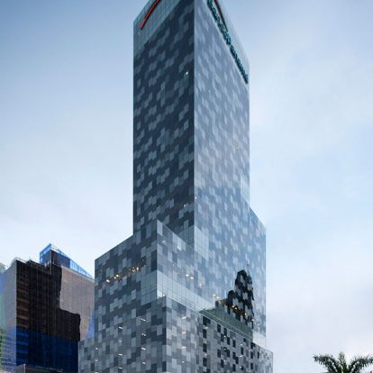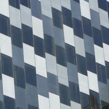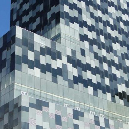 13500m2 de Curtain Wall Sistema IMY-115@ de junta cerrada con manejo de agua en forma defasada por requirimiento de diseño. Louvers en tablillas de aluminio y cristales serigrafiados.