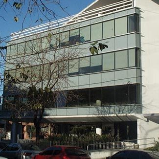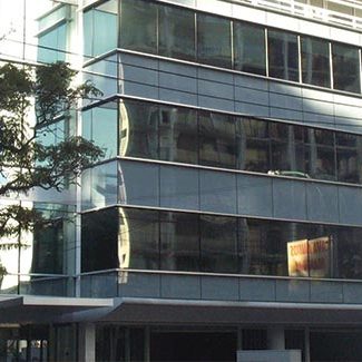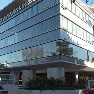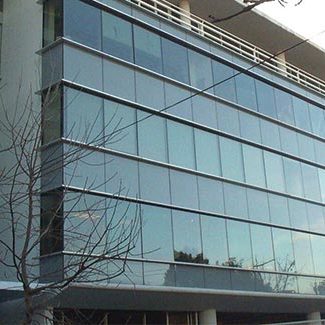 Edificio en tres niveles con frente a tres calles y fachadas interiores, la fachada principal tiene un desarrollo de 107m2 con junta de dilatación intermedia, sumando en total 2300m2 de Curtain Wall unitizado serie IMY-115® y decorativos horizontales exteriores anodizado natural.