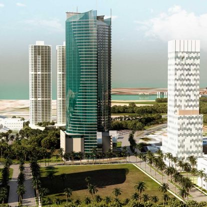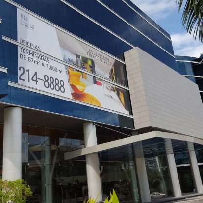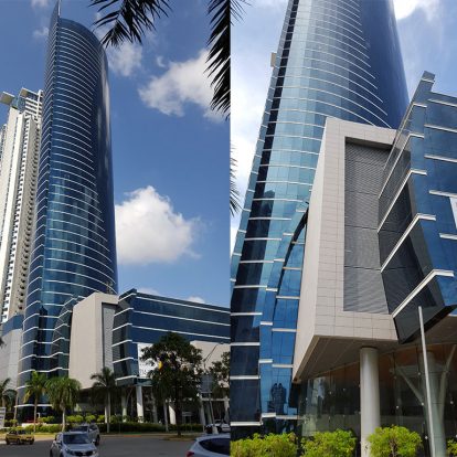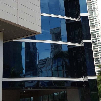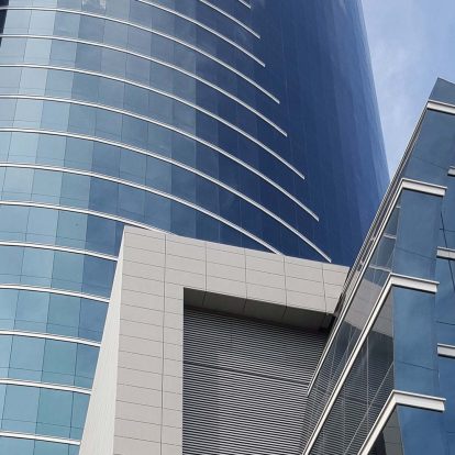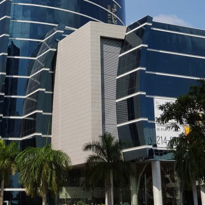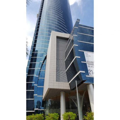 27600m2 de Curtain Wall Sistema IMY-115@ de junta cerrada con manejo de agua. Decorativos de aluminio y composite. Sistema Fullview con costillas en cristales templados en accesos con herrajes en acero inox. Portacochera en cristales y aluminio.