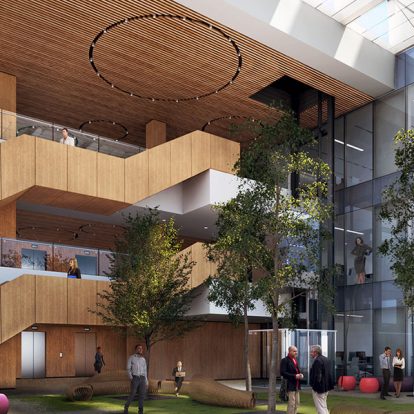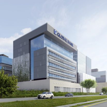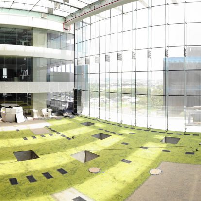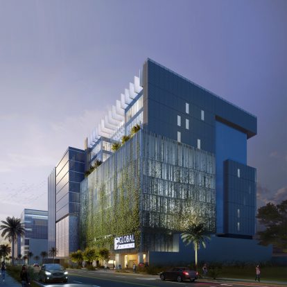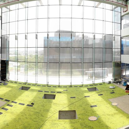 5000m2 de Curtain Wall Sistema IMY-115@ de junta cerrada con manejo de agua. Parasoles verticales en aluminio. Sistema Fullview con costillas en cristales templados en accesos y Skylobby con herrajes en acero inox.