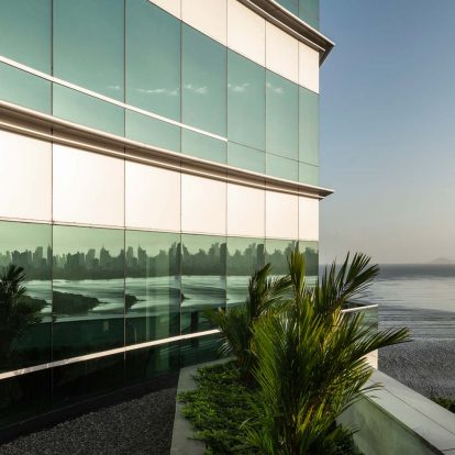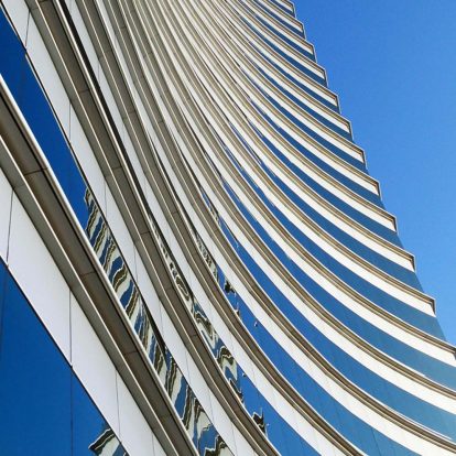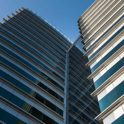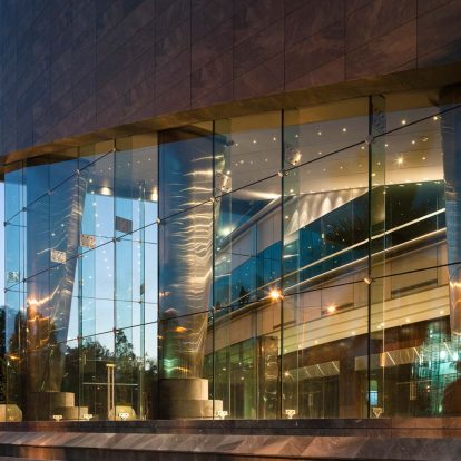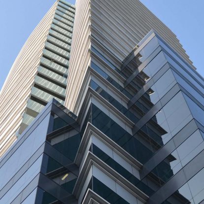 26000m2 de Curtain Wall Sistema IMY-155@ de junta cerrada con manejo de agua. Decorativos tipo parasoles de aluminio y composite. Sistema Fullview con costillas en cristales templados en accesos con herrajes en acero inox. Portacochera en cristales y aluminio.