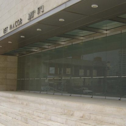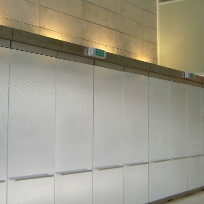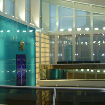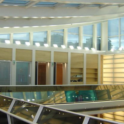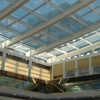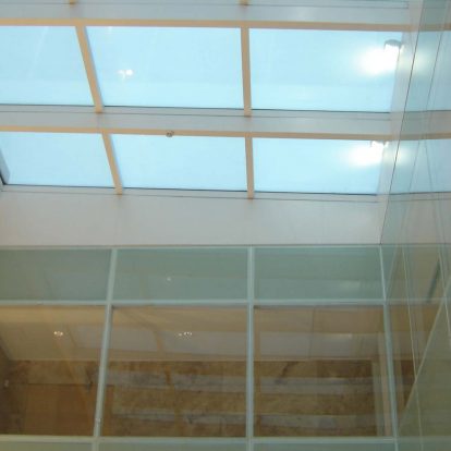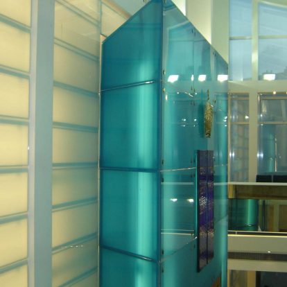 Curtain wall de aluminio estructural, techos vidriados sobre estructura de hierro, altar de cristal azul, accesos y marquesinas de acero inoxidable.
